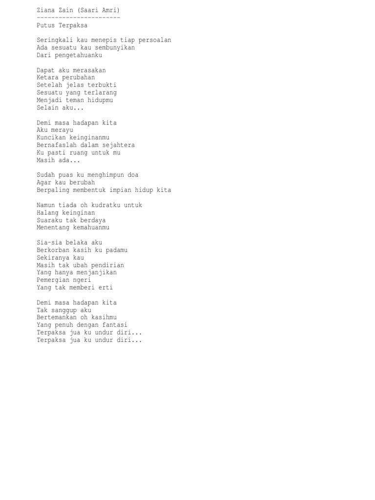 Putus Terpaksa Lyrics By Ziana Zain Seringkali Kau Menepis Tiap